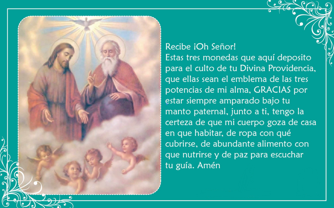 Estas tres monedas que aqu铆 deposito para el culto de tu Divina Providencia, que ellas sean el emblema de las tres potencias de mi alma, GRACIAS por