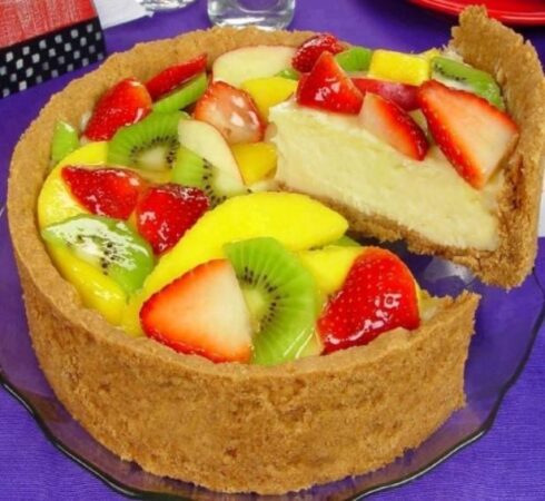 Para el relleno, en una olla, lleve a fuego medio la leche condensada, la leche, el almidón, la margarina y las yemas, revolviendo hasta que espese. Apague, deje enfriar y ya que se extendió sobre la masa de la tarta. Cubra con las frutas cortadas, un cepillo con jalea de brillo y refrigere por 3 horas. Retire y desmolde para servir.